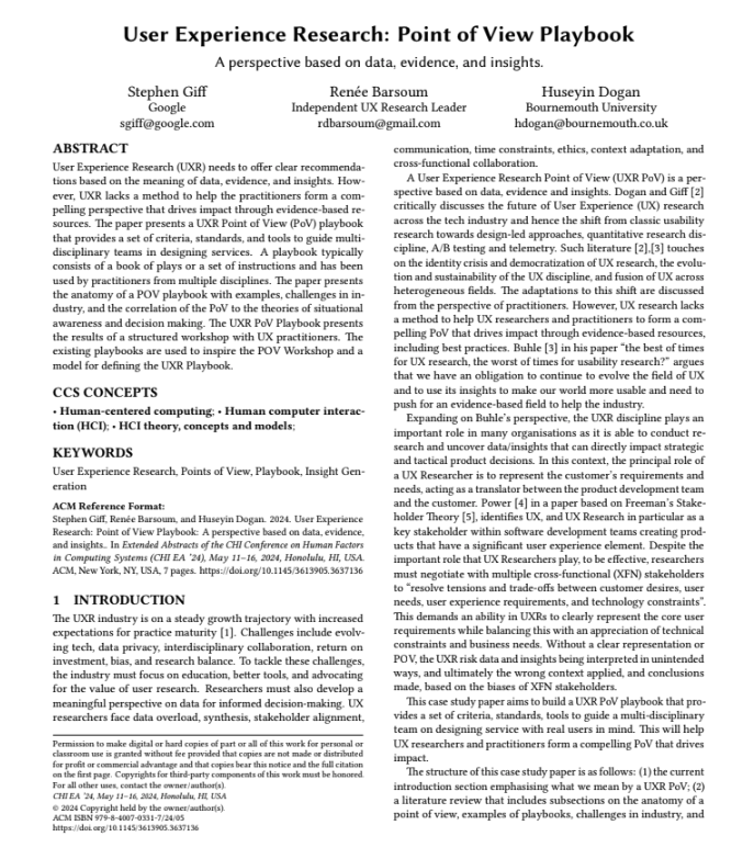 User Experience Research (UXR) needs to offer clear recommendations based on the meaning of data, evidence, and insights. However, UXR lacks a method to help the practitioners form a compelling perspective that drives impact through evidence-based resources. The paper presents a UXR Point of View (PoV) playbook that provides a set of criteria, standards, and tools to guide multi-disciplinary teams in designing services. A playbook typically consists of a book of plays or a set of instructions and has been used by practitioners from multiple disciplines. The paper presents the anatomy of a POV playbook with examples, challenges in industry, and the correlation of the PoV to the theories of situational awareness and decision making. The UXR PoV Playbook presents the results of a structured workshop with UX practitioners. The existing playbooks are used to inspire the POV Workshop and a model for defining the UXR Playbook.